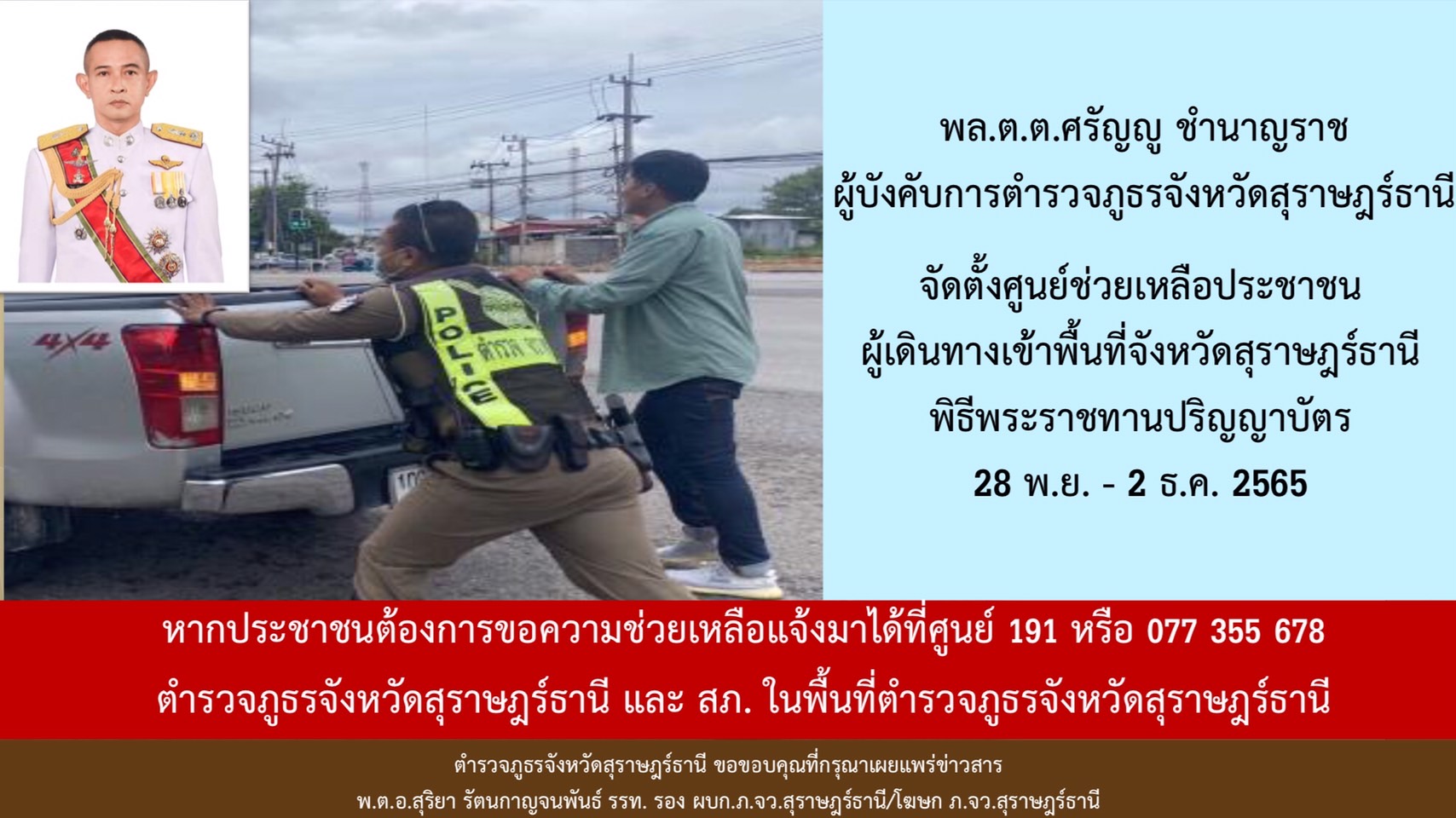 พล.ต.ต.ศรัญญู ชำนาญราช ผบก.ภ.จว.สุราษฎร์ธานี จัดตั้งศูนย์ช่วยเหลือประชาชนผู้เดินทางเข้าพื้นที่จังหวั