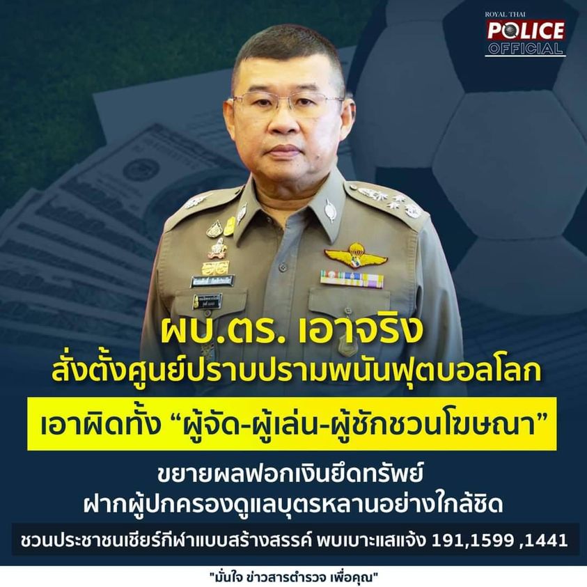ผบ.ตร. เอาจริง สั่งตั้งศูนย์ปราบปรามพนันฟุตบอลโลก เอาผิดทั้ง “ผู้จัด-ผู้เล่น-ผู้ชักชวนโฆษณา” ขยายผลฟ