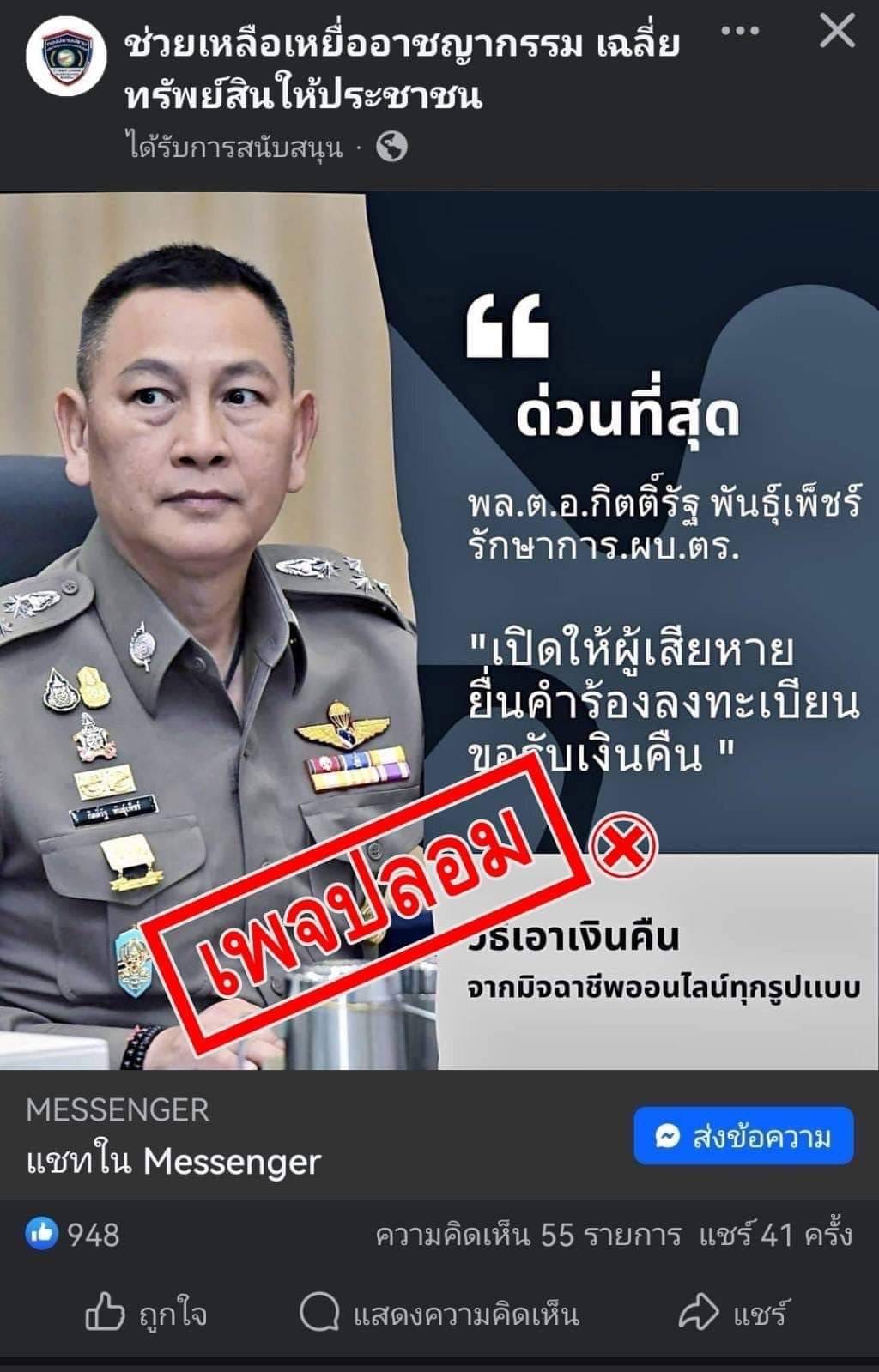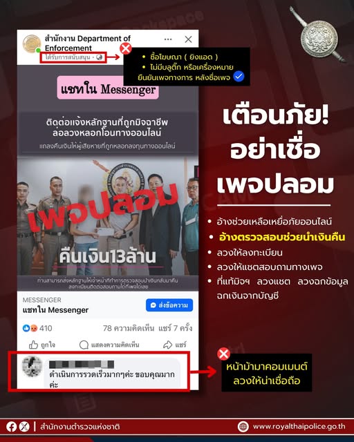 ใช้ภาพของตำรวจ หรือเจ้าหน้าที่รัฐ และมักมีหน้าม้ามาคอมเมนต์ว่าช่วยเหลือได้จริง สร้างความน่าเชื่อถือ จุดสังเกตง่าย ๆ #เพจปลอม ของมิจฉาชีพมักซื้อโฆษณา หรือยิงแอด โดยจะมีข้อความ “ได้รับการสนับสนุน”