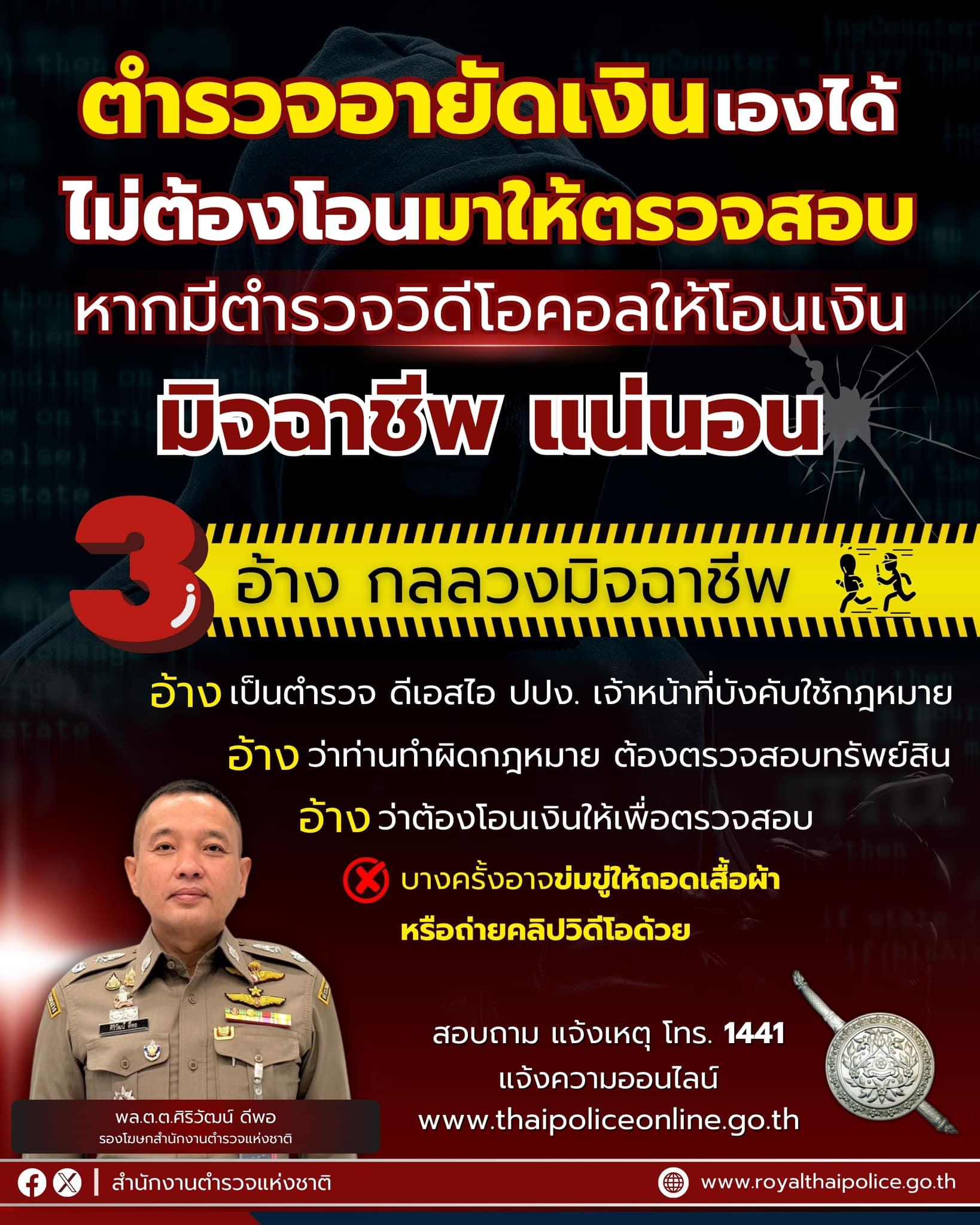 สำนักงานตำรวจแห่งชาติเตือนไม่มีการรับแจ้งความ-ลงทะเบียนคืนเงินผ่านโซเชียล การรับแจ้งความออนไลน์มีเพียงเว็บไซต์เดียวเท่านั้น คือ www.thaipoliceonline.go.th